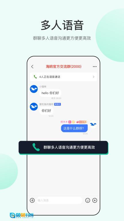 1.多人语音功能:支持在群聊场景下发起多人语音通话,助力提升沟通效率。