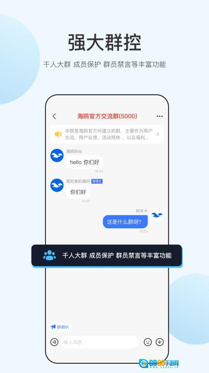 2.高效群控:支持千人大群的管理,配备成员保护、禁言等功能,助力维护群组的有序氛围。
