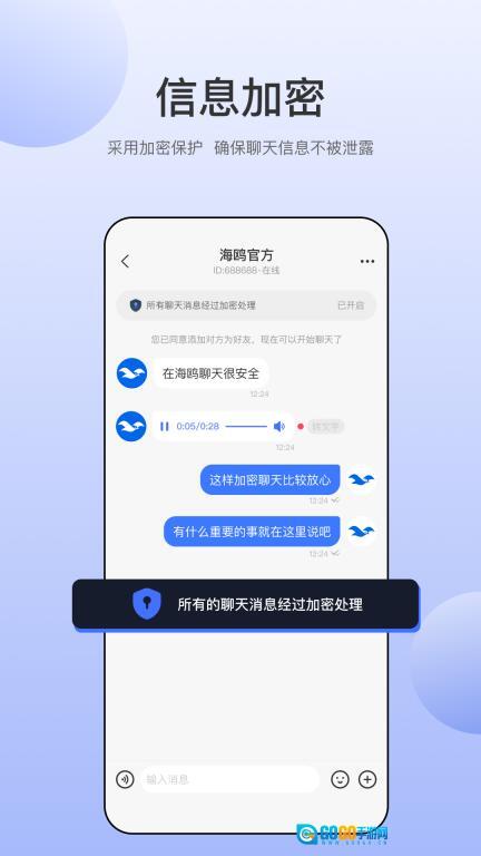 海鸥是成都争渡科技有限公司推出的一款高效便捷、安全可靠的加密即时通讯社交软件,采用先进加密算法保障用户聊天隐私,让人们能安心交流。无论工作还是生活场景,用户都可随时收发消息,与好友进行语音、视频聊天,畅享便捷沟通体验。海鸥为每个人搭建安全高效的沟通渠道,让每一次交流都更顺畅。