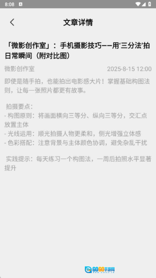 文章页面里包含了十分详尽的摄影技巧,用户能够第一时间浏览各类相关文章。