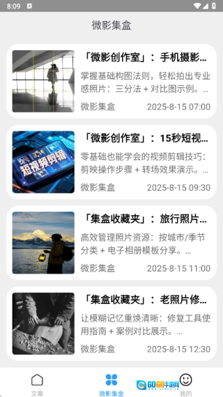 微影集盒作为专注影像创作与管理的平台,设有微影创作室和集盒收藏夹两大核心板块:前者依托手机摄影及短视频教程,帮助用户快速掌握轻量化的影像创作技能;后者则以主题化管理与记忆存档为特色,让用户能更便捷地对各类影像内容进行分类收藏与系统整理。