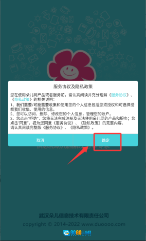 首次打开应用时,需在弹出的服务协议窗口中点击确定,方可进入注册流程。