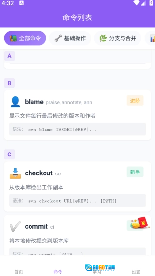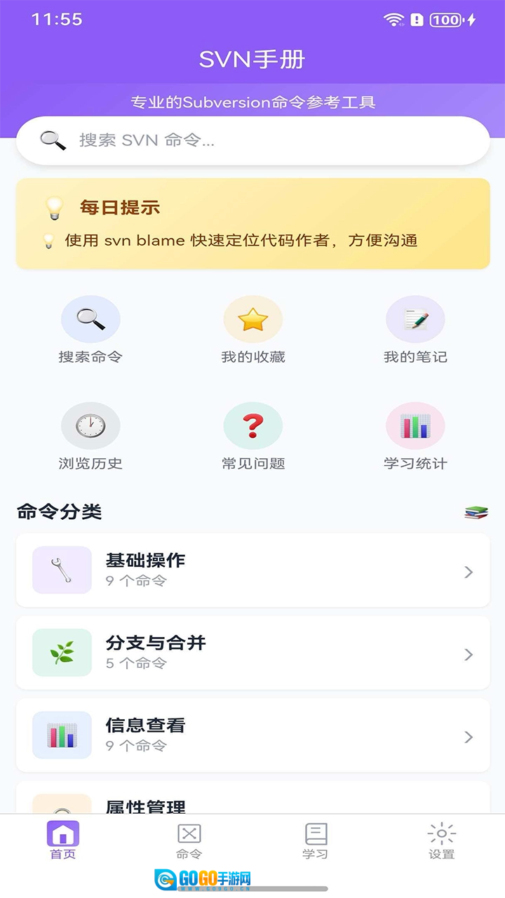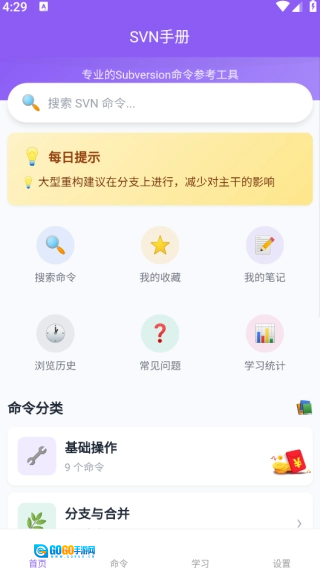 在首页,您能够浏览到SVN手册的所有功能。页面顶部设有一个搜索框,用户输入SVN命令后,就能迅速获取相关搜索结果。搜索框下方则展示着所有的功能板块。