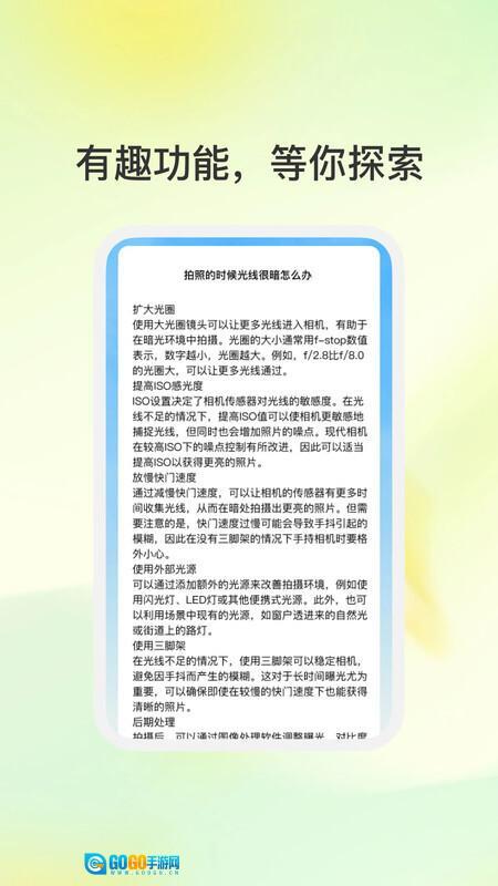 3、实用拍摄知识科普,涵盖暗光拍摄技巧与构图建议等内容,从多方面提升用户摄影水平,帮助用户拍出更优质的作品。