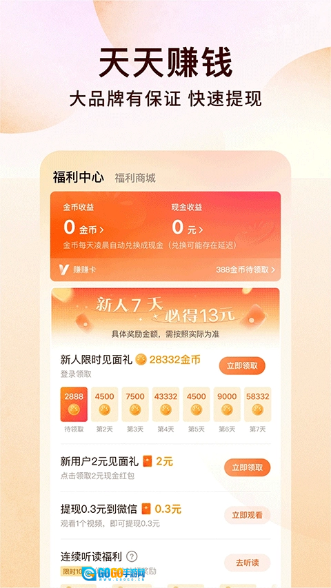签到领福利,金币享福利,阅读得福利……各类福利这里全都有,随时都能提现,只要你每天常来阅读就可以!