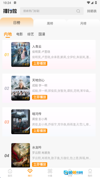 2、在排行页面查看日榜、周榜和月榜的最新动态,以便及时开展快速播放操作。