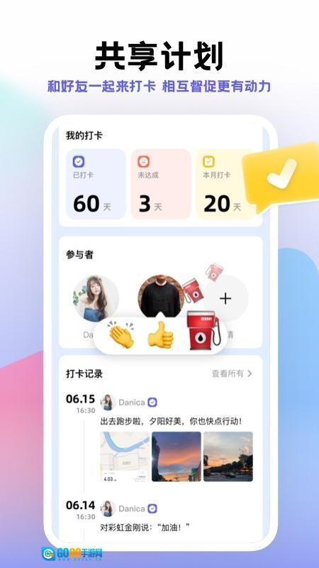 5. 社交分享功能:用户能够把自己的打卡记录和收获分享至社交平台,和朋友一同分享成长的快乐。