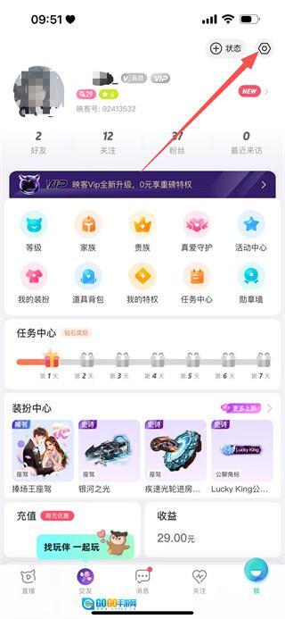 2、进入个人页面后,点击右上角的设置图标,即可进入设置页面。
