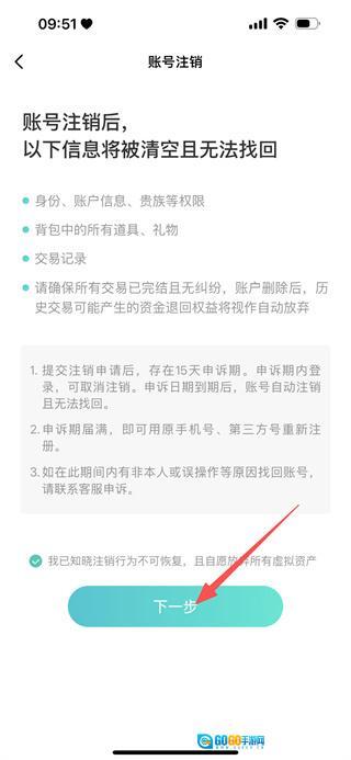 5、进入账号注销说明页面后,勾选“自愿放弃所有虚拟资产”选项,接着点击下一步按钮。