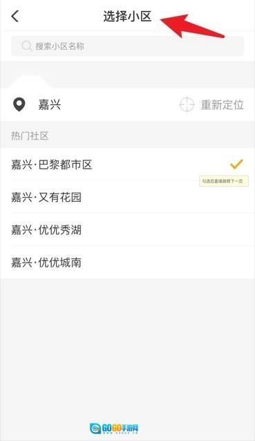 选择小区时,既可以通过搜索功能查找城市,也能手动定位城市;找到目标小区后,点击其对应的名称,即可完成地址绑定的操作。