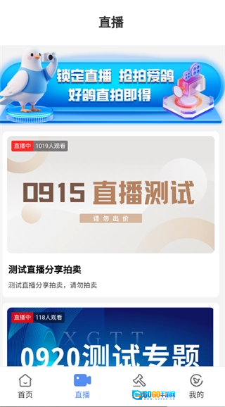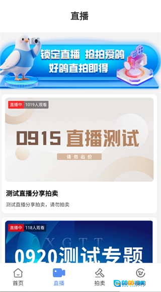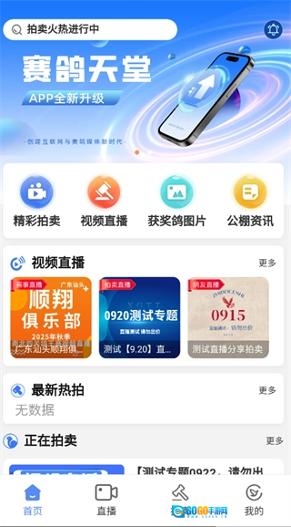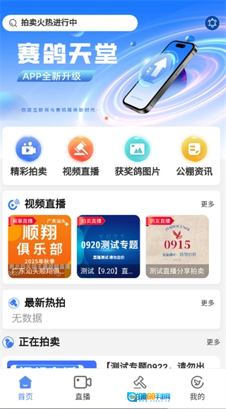 在首页就能看到精彩拍卖、视频直播、获奖鸽图片等功能模块。