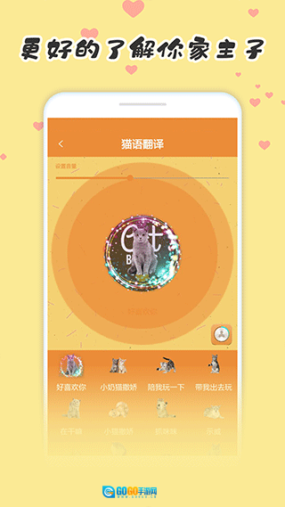 1、猫咪语言翻译功能,支持识别常见的猫咪喵喵叫声,还能记录翻译内容并反馈给猫咪;