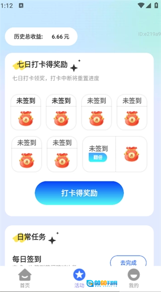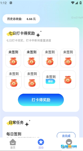 点击页面下方的“活动”按钮,就能看到打卡领奖励、日常任务等相关功能。
