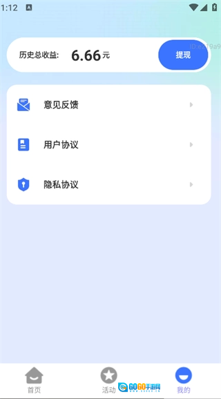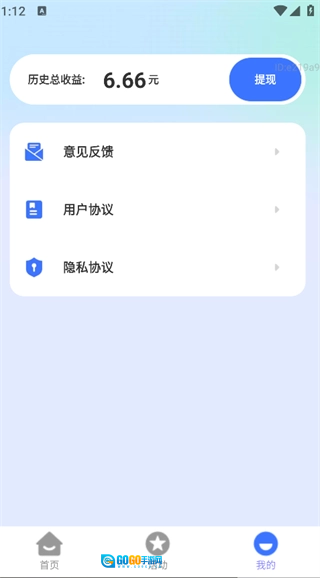 点击页面底部的“我的”选项,就能查看历史总收益、意见反馈、用户协议等相关功能。