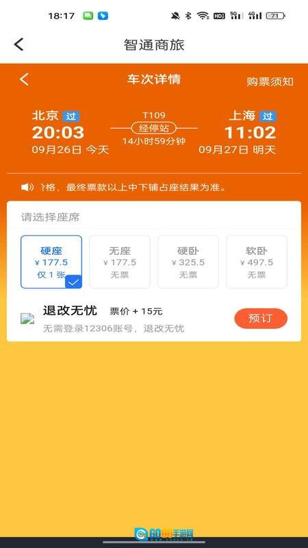 灵活选座:硬座、软卧、商务座等座位类型清晰呈现,契合多样出行需求,选座更自由。