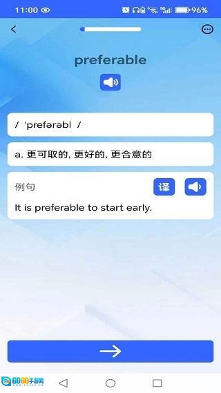 进入对应的单词背诵板块后,这里会呈现词汇的具体内容、搭配的例句,同时还提供了标准发音作为参考。