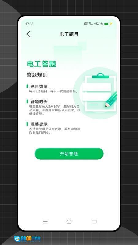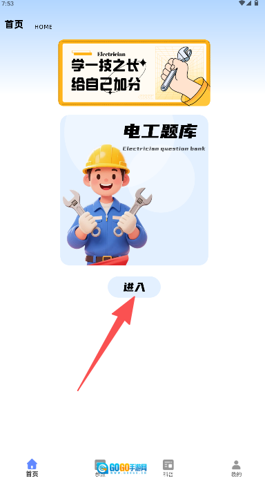 1、在首页找到“电工题库”板块,点击其下方的“进入”按钮即可开始使用。