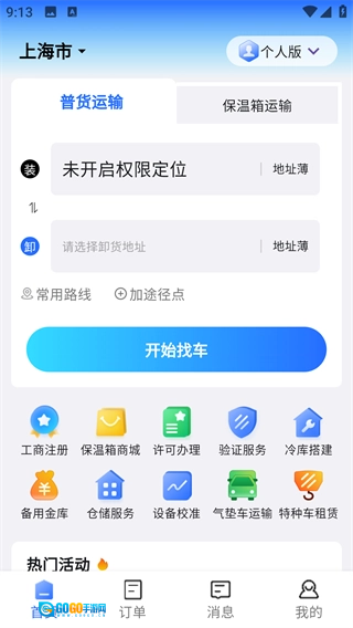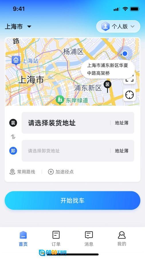 在首页上方输入出发地和目的地,点击“开始找车”按钮,就能找到合适的运输车辆。