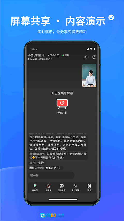 同时,为了让用户在直播时更便捷,软件提供了多样功能,包括快速创建直播、高级美颜、连麦互动、屏幕共享、成员管理等,让每位直播用户都能拥有专业化体验。此外,软件还设有课件演示和文件盘等功能,助力教育行业用户更好地展示课件,提升直播效果。普通用户观看直播时,开播会收到提醒。