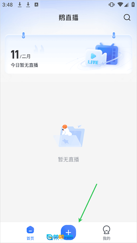 2、店铺完成注册开通后,您可以在手机端打开鹅直播,通过手机验证码登录,随后点击底部的添加按钮。