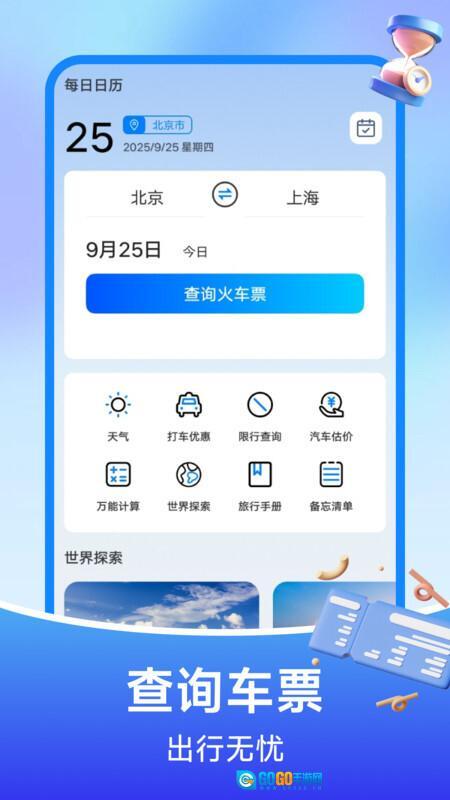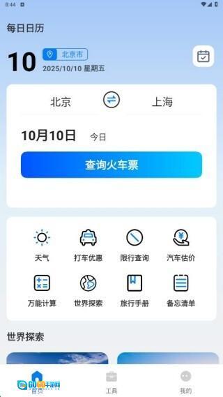 1、进入首页,可看到火车票查询功能,同时还有天气、打车优惠、限行查询等服务板块。