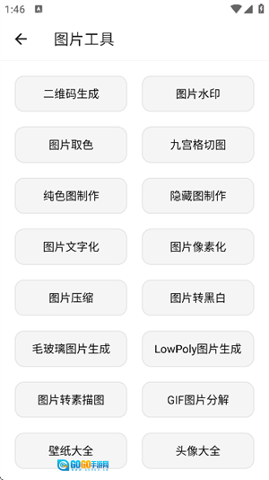 4、点击进入功能板块后,能看到不少实用工具类型,像二维码生成、图片加水印、九宫格切图、图片压缩之类的功能都有,比较适合要对图片进行编辑处理的用户。