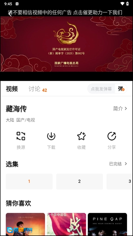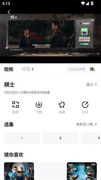 我们随意点开一部电视剧,就能看到弹幕、换源、收藏、分享等一系列功能。