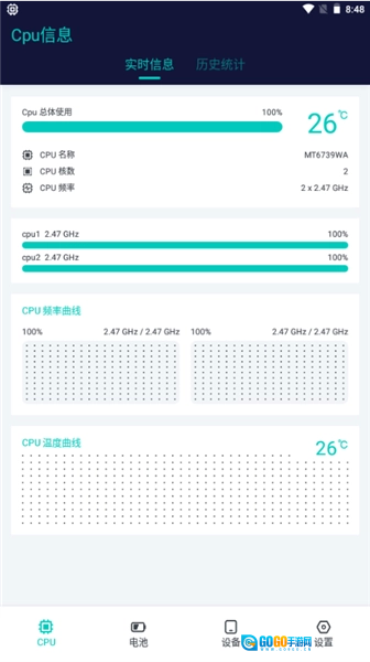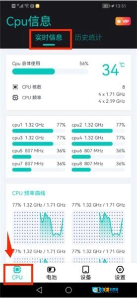 在主界面点击CPU选项,就能查看实时使用率以及核心数据。