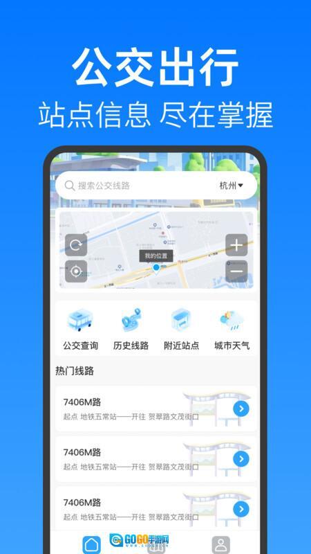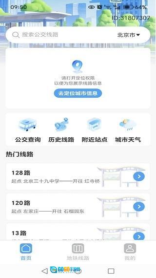 1、完成安装并进入首页后,即可使用定位、搜索功能,同时还能获取热门公交线路推荐服务。