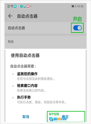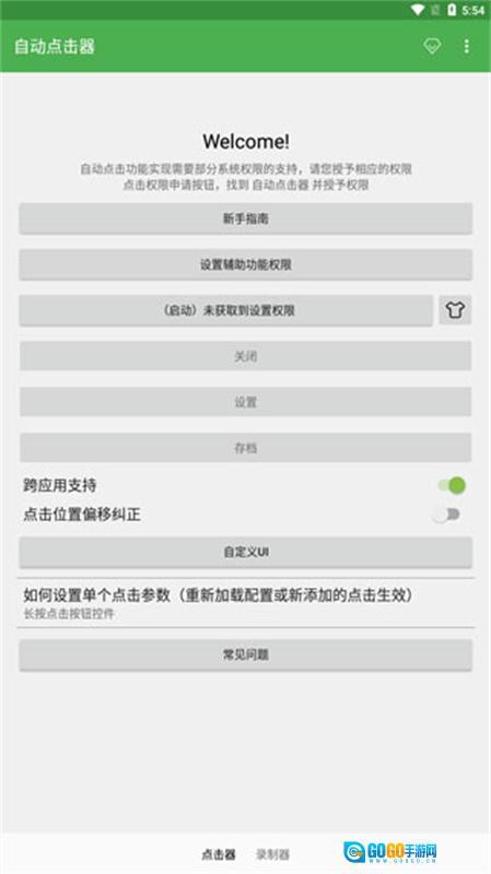 3、点击灰色按钮以启用“自动点击器”,随后返回应用界面。