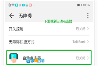2、进入系统设置界面后,找到“自动点击器”功能选项并点击进入,随后选择开启该功能。