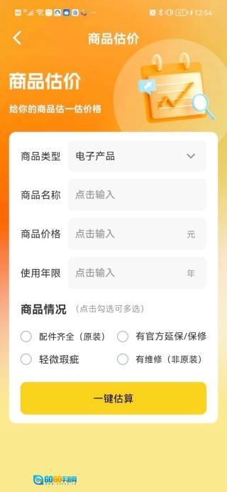 点击商品估价功能,选定对应的商品类型后,输入商品名称、价格、使用年限以及商品现状,就能一键快速完成估算。