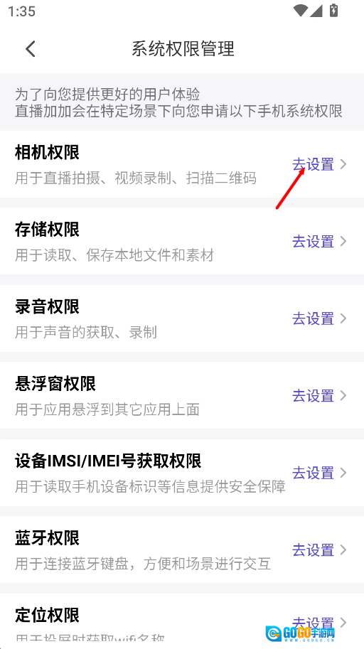点击“去设置”按钮后,会跳转到系统设置页面,你可以在该页面手动开启或修改对应的权限。