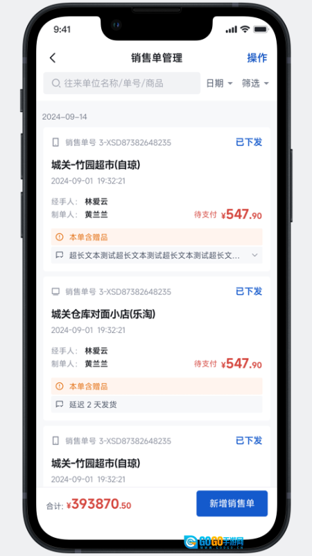 3、可对销售订单进行新增、查询与编辑操作,并能详细记录订单金额、赠品、发货状态等相关信息。