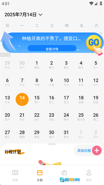 3、出行计划:支持在线制定最新的旅游出行计划,用户可依据自身时间安排创建对应的旅游计划。