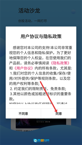 1、在【活动沙龙】的【用户协议与隐私政策】弹窗里,仔细阅读相关条款后点击【同意】按钮,就能进入应用后续的操作页面了。