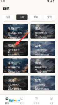 2、支持主题板块的切换,可选择咏物、思乡等不同主题,并查看对应主题下的诗词作品。