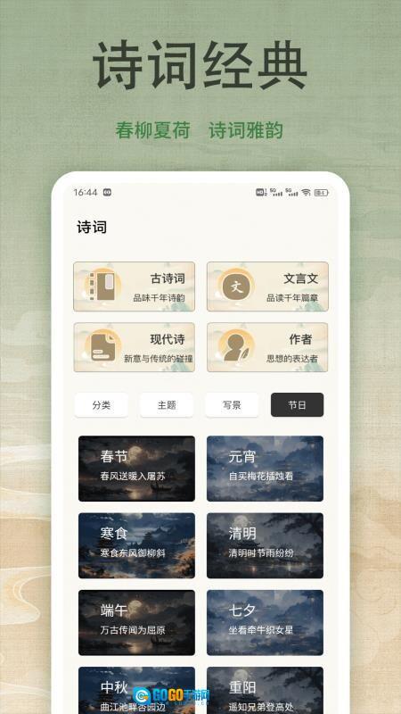 1、诗词分类维度多元,既依据朝代类别进行划分,又按照主题方向加以归类,有助于精准定位到对应的内容。