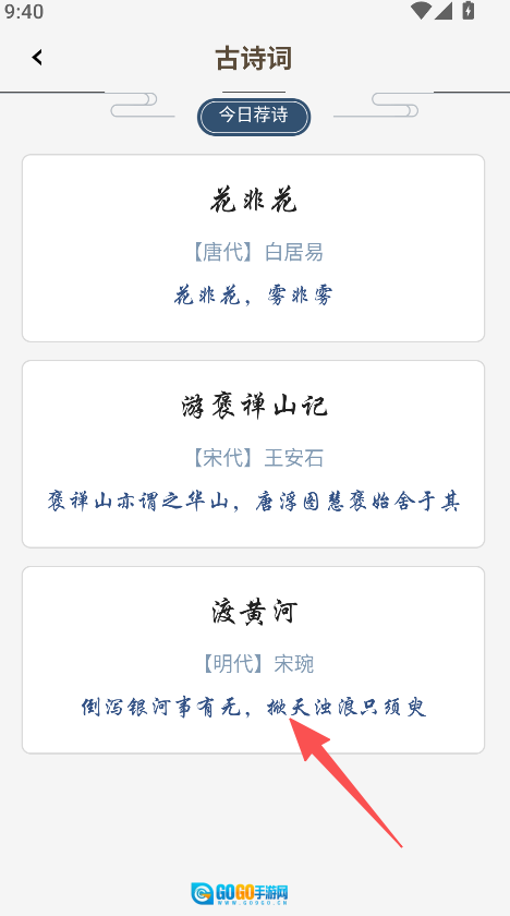 3、今日荐诗栏目每日都会呈现不同的诗词作品,让大家能够接触到不同朝代、不同风格的诗词,从而丰富自身的诗词积累。