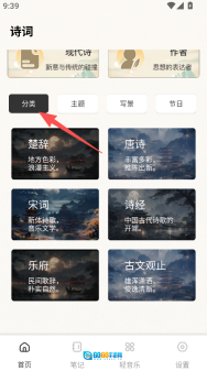 1、启动软件后,进入首页并选择分类板块,浏览各类诗词的不同内容。