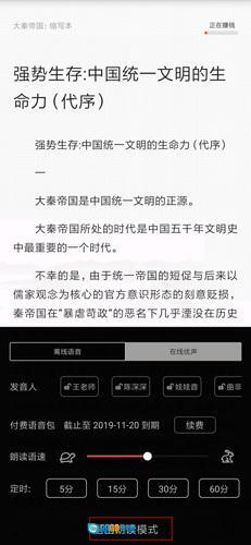 3、用户可自主挑选心仪的发音人、朗读速度和朗读时间,若不想继续收听,还能点击“退出朗读模式”按钮。