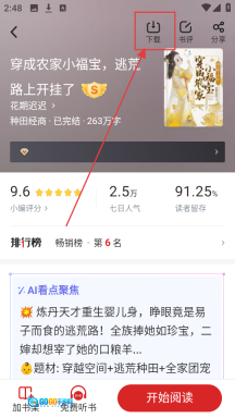 2、在《穿成农家小福宝,逃荒路上了》的详情页,要是想缓存小说,点击【】按钮,就会弹出和缓存功能相关的提示啦。