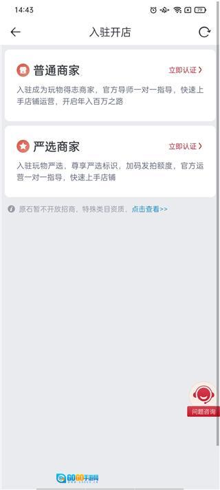 2、点击右下角的“我的”,找到商家入驻入口,根据你开设的店铺类型选择普通商家或严选商家,然后点击立即认证按钮。