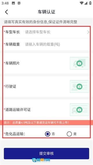 4、进入【车辆认证】页面,依次填写【车型车长】【车辆载重】等相关信息,上传规定所需的证件材料后,点击【提交审核】按钮,即可完成该步骤操作。