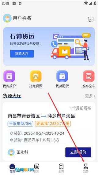 1、打开【石钟货运】首页,点击底部导航栏中的【我的】选项,即可进入个人相关功能页面。