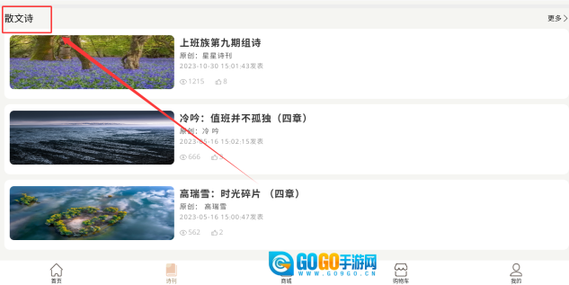 进入散文诗板块后,可向下滑动浏览内容,选择感兴趣的散文诗,点击“更多”选项,继续翻阅后点击“阅读”按钮即可开始阅读。