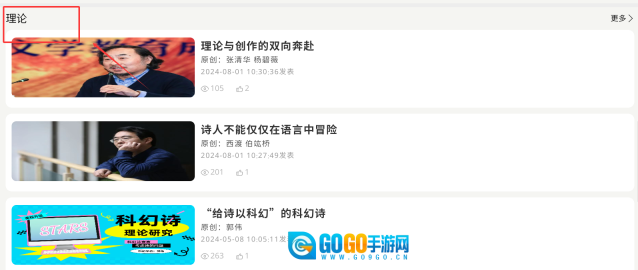3、点击“理论”选项,进入后可点击“更多”,翻阅相关内容后点击文章进行阅读。