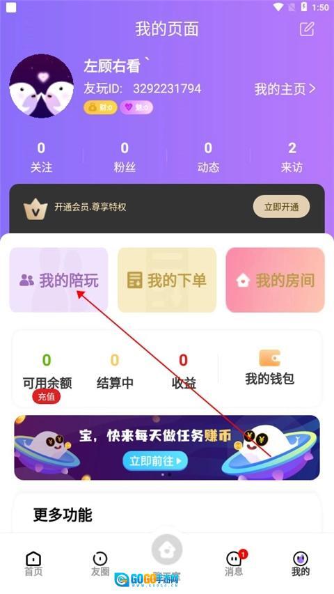 在本站安装并打开友玩陪玩应用,登录账号进入软件主界面后,点击进入“我的”页面,在该页面中找到“我的陪玩”选项。