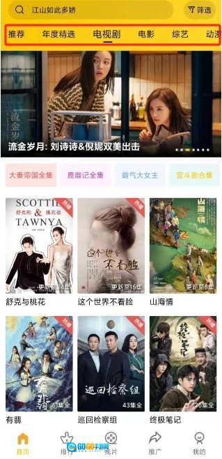打开整点视频的功能后,在首页会看到一排分类选项,像年度精选、电视剧、电影、综艺等都包含在内,你可以依据这些分类来浏览内容,从而找到自己想看的电影或电视剧。