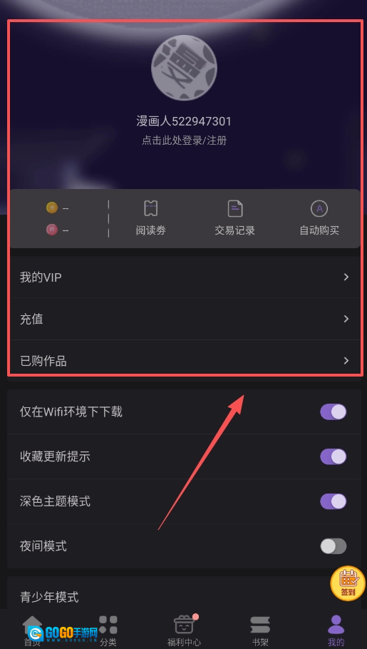 首先要搭建你的个人阅读根据地,也就是完成登录和初步配置,尤其要在“我的”页面里开启收藏更新提醒。